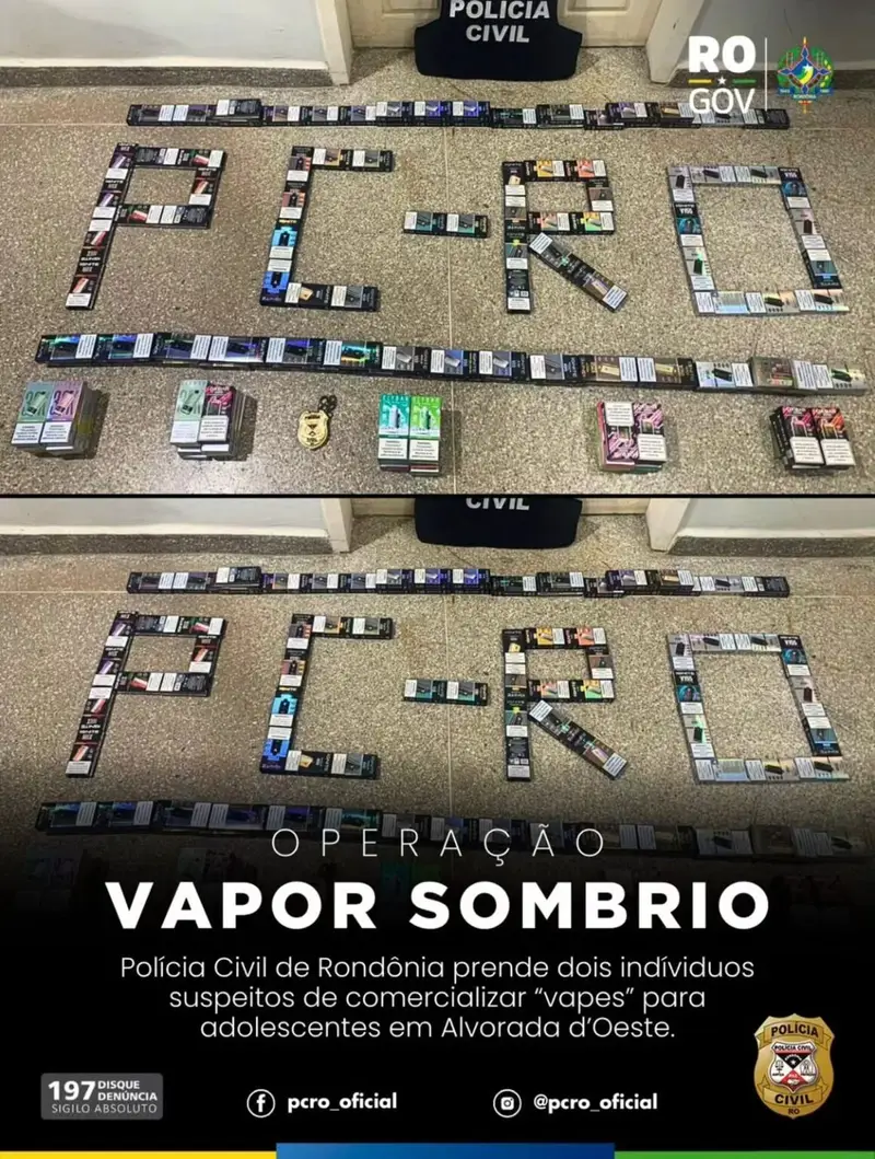 Uma operação policial realizada na manhã desta quarta-feira (11) terminou com a prisão em flagrante de dois homens suspeitos de armazenar e comercializar cigarros eletrônicos, conhecidos como “vapes”, em Alvorada d’Oeste. A ação foi conduzida pela 1ª Delegacia de Polícia Civil do município, dentro da Operação Vapor Sombrio.