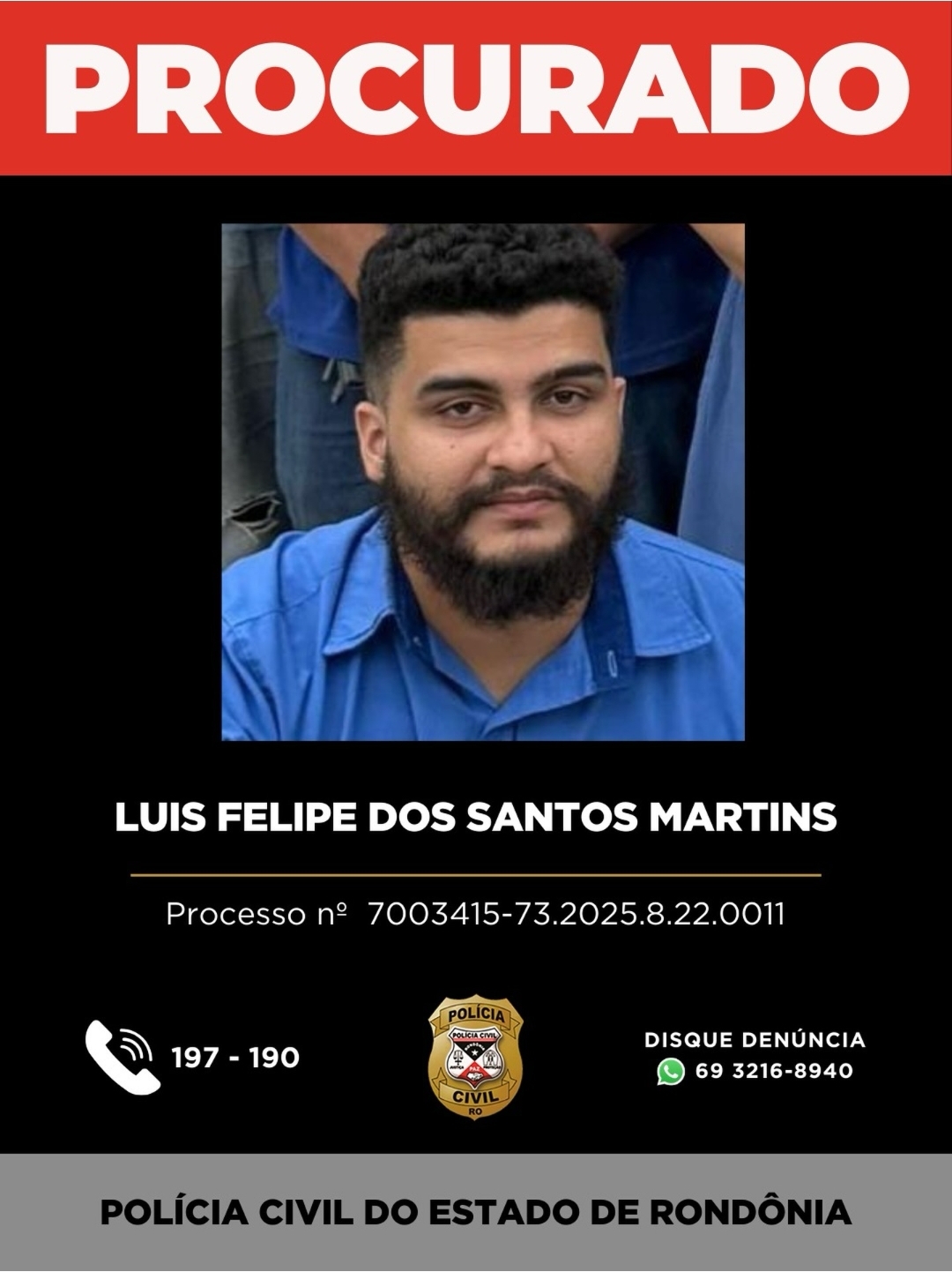 URUPÁ | RO – A Polícia Civil de Rondônia, por intermédio da 12ª Delegacia de Polícia de Urupá, emitiu um comunicado oficial nesta data solicitando o auxílio da população para a localização e captura de Luis Felipe dos Santos Martins. O suspeito é considerado foragido da Justiça e possui um mandado de prisão preventiva em aberto sob o Nº 7003415-73.2025.8.22.0011.